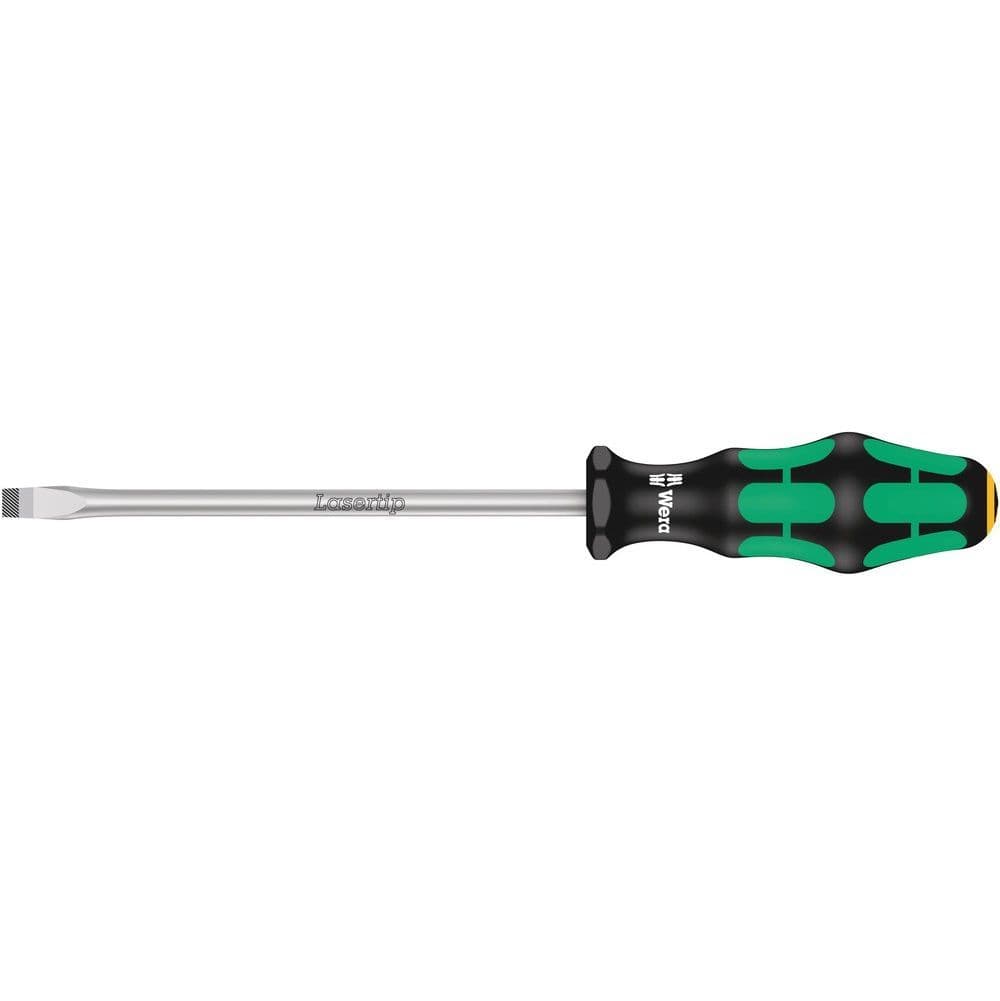 Premium Kraftform Plus screwdriver. Multi-component Kraftform Plus handle for comfortable ergonomic screwdriving, which avoids blisters and calluses. Hard handle zones for high working speeds, while soft handle zones guarantee a high torque transfer. The tips of Wera Lasertip screwdrivers are microscopically roughened with laser beams. This rough surface "bites" into the screw head and unintentional slipping is a thing of the past. "Take it easy" tool finder with colour coding by profile and size stamping - for quick and easy identification of the required tool . The hexagon anti-roll protection avoids bits from rolling away annoyingly at the workplace.