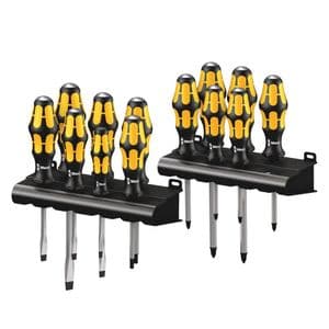 Wera Chiseldriver set for fastening, chiselling and loosening seized screws. Multi-component Kraftform handle for fast and low-fatigue working: hard gripping zones for high working speeds whereas soft zones ensure high torque transfer. A hexagon blade out of high quality bit material that extends right through the blade ensures full transfer of force, even when struck with a hammer. The ductile tempered material prevents the blade from splintering or breaking. Comes with an integrated impact cap for enhanced durability and reduced risk of splintering. More torque can be transferred with the help of an open-end or ring spanner applied to the integrated hexagonal bolster. The Wera Black Point tip and a complex hardening process ensure a long service life of the tip, enhanced corrosion protection and an exact fit. The hexagonal anti-roll feature prevents any bothersome rolling away at the workplace and handle markings make for simplified finding and sorting of the tool. All frequently needed screwdriving profiles in a single set. Includes 2 racks for tidy storage.