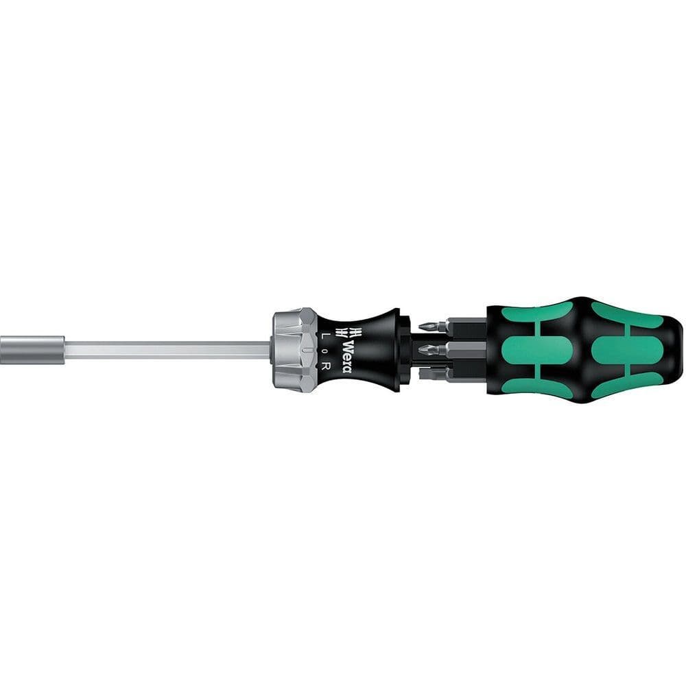 Wera compact tool with multi-component Kraftform handle for high working speeds and particularly ergonomic screwdriving. Integrated bit magazine in the handle. Includes ratchet: fine-pitched for small return angle, switchover ring (right, fixed, left), maximum torque of up to 50 Nm; hexagonal blade with ¼" hexagon socket take-up, stainless sleeve, strong permanent magnet.