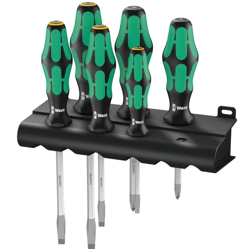 6-piece screwdriver set with Kraftform Plus handle for pleasant, ergonomic working that makes blisters and calluses a thing of the past. Hard gripping zones for high working speeds whereas soft zones ensure high torque transfer. The Lasertip tip literally bites into the head of the screw and thereby prevents any slipping. More torque can be transferred with the help of an open-end or ring spanner applied to the hexagonal blade and the integrated bolster. "Take it easy" Tool Finder: colour coding according to profile and size. The hexagonal anti-roll feature prevents any bothersome rolling away at the workplace. Including a practical rack for tidy storage of the screwdrivers.