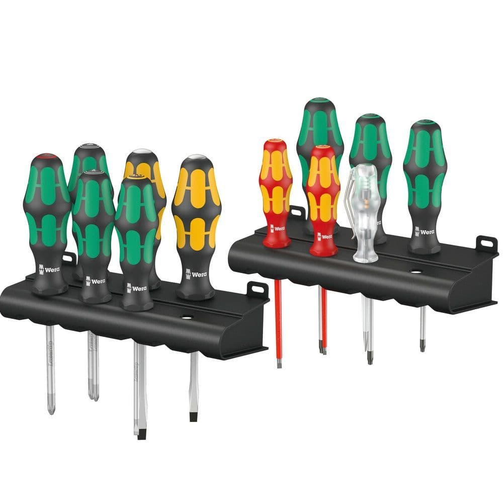 12-piece all-round screwdriver set. Kraftform Plus handle for pleasant, ergonomic working that prevents blisters and calluses. Hard gripping zones for high working speeds whereas soft zones ensure high torque transfer. Partially with Lasertip: The tips of the Wera Lasertip screwdrivers are microscopically roughened by laser beams. This rough surface literally bites into the head of the screw. Any unintentional slipping out is therefore a thing of the past. "Take it easy" tool finder with colour coding according to profiles and size stamp - for simple and rapid accessing of the required tool.